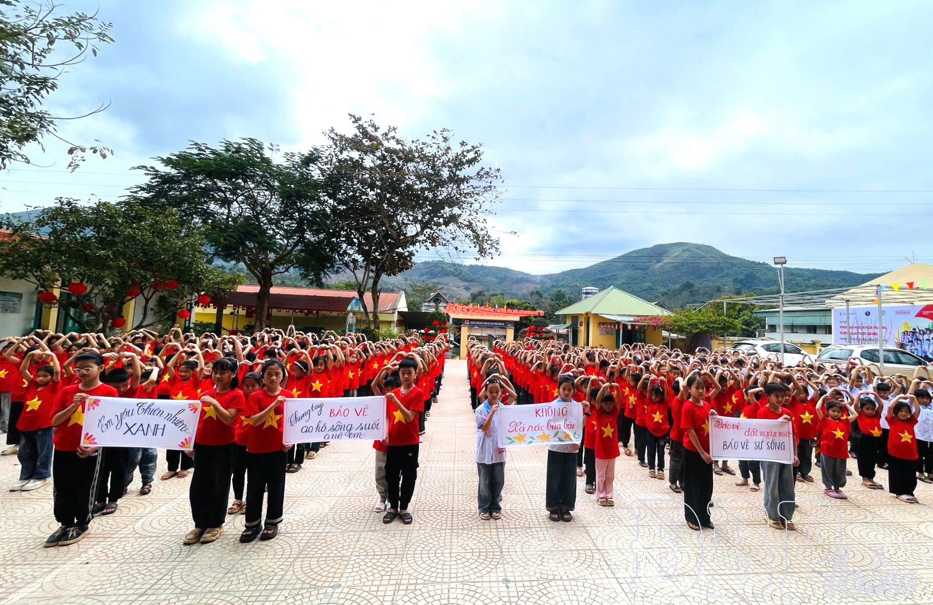 Học sinh Trường Phổ thông dân tộc bán trú Tiểu học Bản Bua, xã Búng Lao hưởng ứng chiến dịch bảo vệ môi trường.