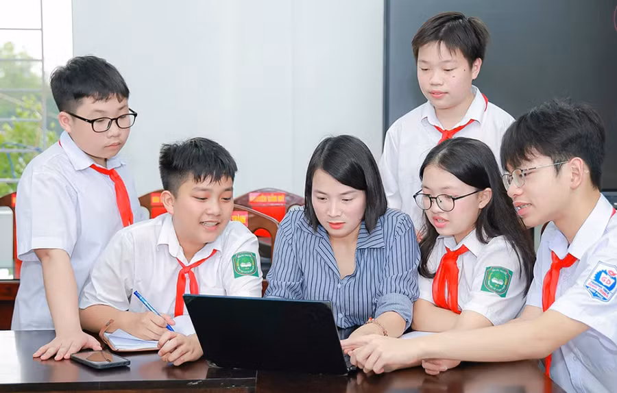 Cô Đào Thị Hồng Cường hướng dẫn nhóm học sinh Trường THCS Định Trung thực hiện dự án 'AI - No Vape Life'.