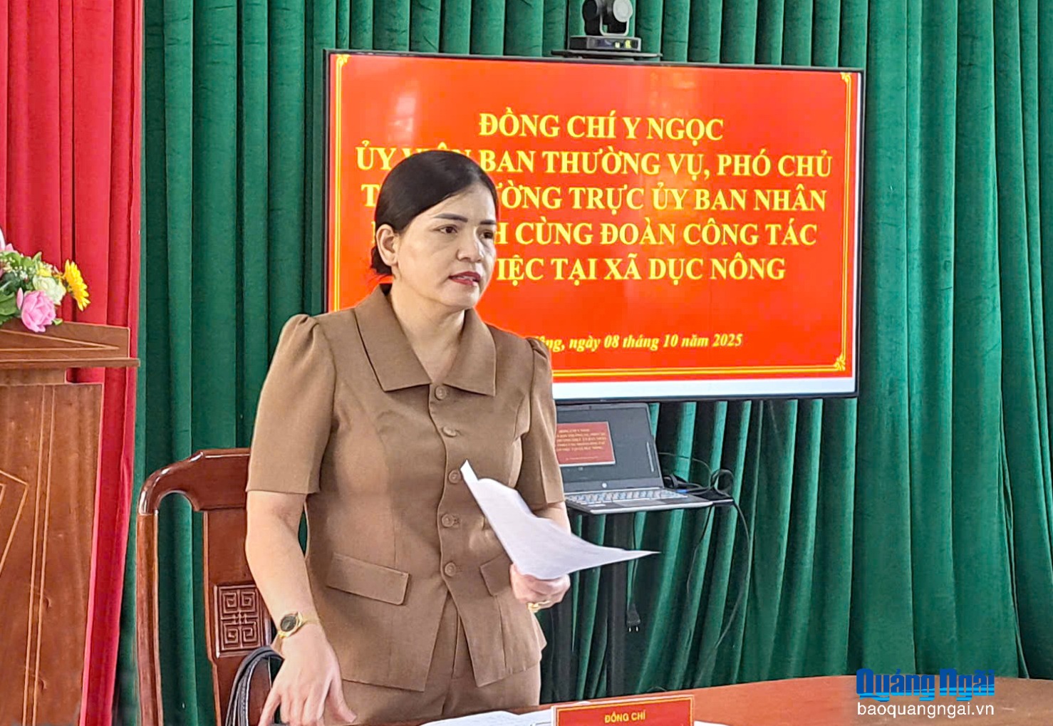 Phát biểu tại buổi làm việc, Phó Chủ tịch Thường trực UBND tỉnh Y Ngọc đề nghị tập thể Ban Chấp hành, Ban Thường vụ, cán bộ, đảng viên, công chức, viên chức và các tầng lớp nhân dân trên địa bàn tiếp tục phát huy tinh thần đoàn kết, cùng nhau xây dựng xã Dục Nông ngày càng phát triển toàn diện, vững mạnh.