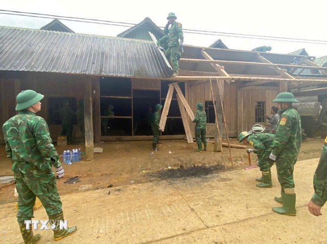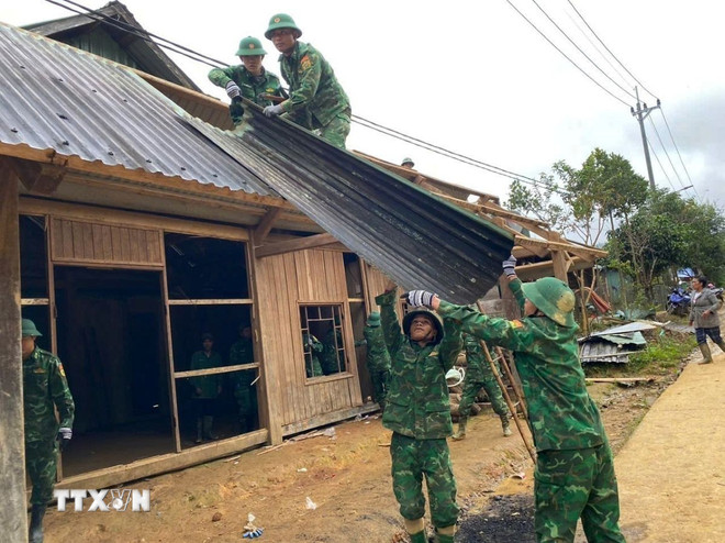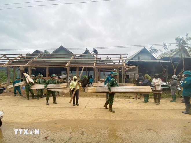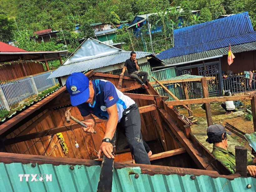 Lực lượng tại chỗ được chính quyền địa phương huy động để sửa chữa nhà bị hư hỏng nặng cho đồng bào xã Trà Linh. (Ảnh: Đoàn Hữu Trung/TTXVN)