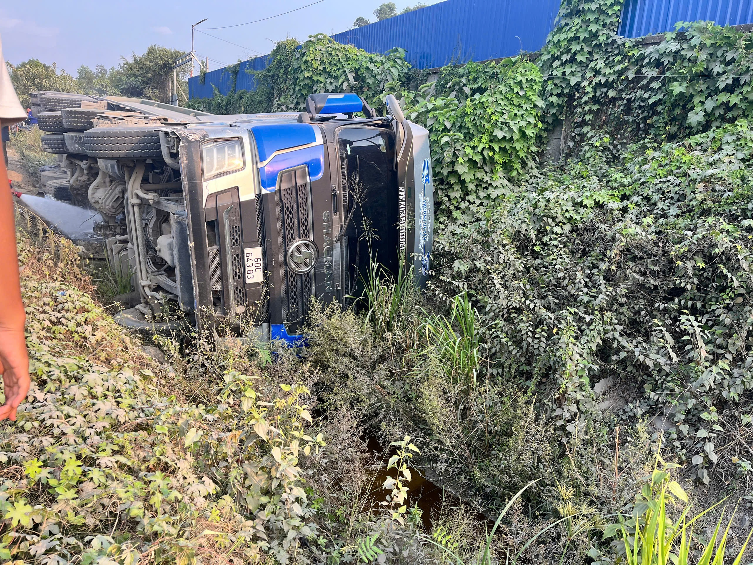 Cú va chạm khiến ô tô mất lái, lao xuống mương nước rộng hơn 4m, sâu gần 2m bên trái đường. Ngay sau đó, xe ben lật nghiêng, đè trực tiếp lên ô tô. Hàng tấn đá trên thùng xe đổ xuống, phủ kín khu vực, khiến nạn nhân mắc kẹt bên trong.