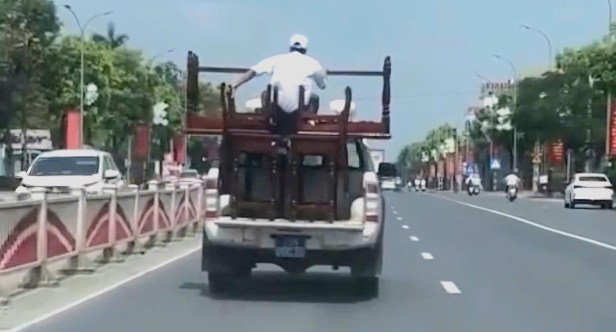 Trước đó, khoảng 10h37 ngày 22-3, người dân phản ánh tại khu vực trung tâm phường Hương Trà xuất hiện ô tô bán tải biển số xanh 75M-000.25 chở bàn ghế xếp chồng phía sau thùng. Đáng chú ý, một người đàn ông ngồi trực tiếp trên số hàng hóa này khi xe đang di chuyển.