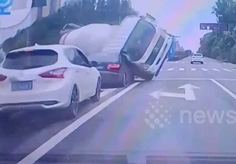 Theo hình ảnh từ camera hành trình của một ô tô di chuyển phía sau, chiếc xe bồn chở xi măng đang lưu thông bình thường thì bất ngờ mất cân bằng và lật nhào ngay tại ngã tư. Cú lật mạnh khiến toàn bộ thùng xe đổ ập lên chiếc Audi A6 đang dừng chờ tín hiệu đèn giao thông.