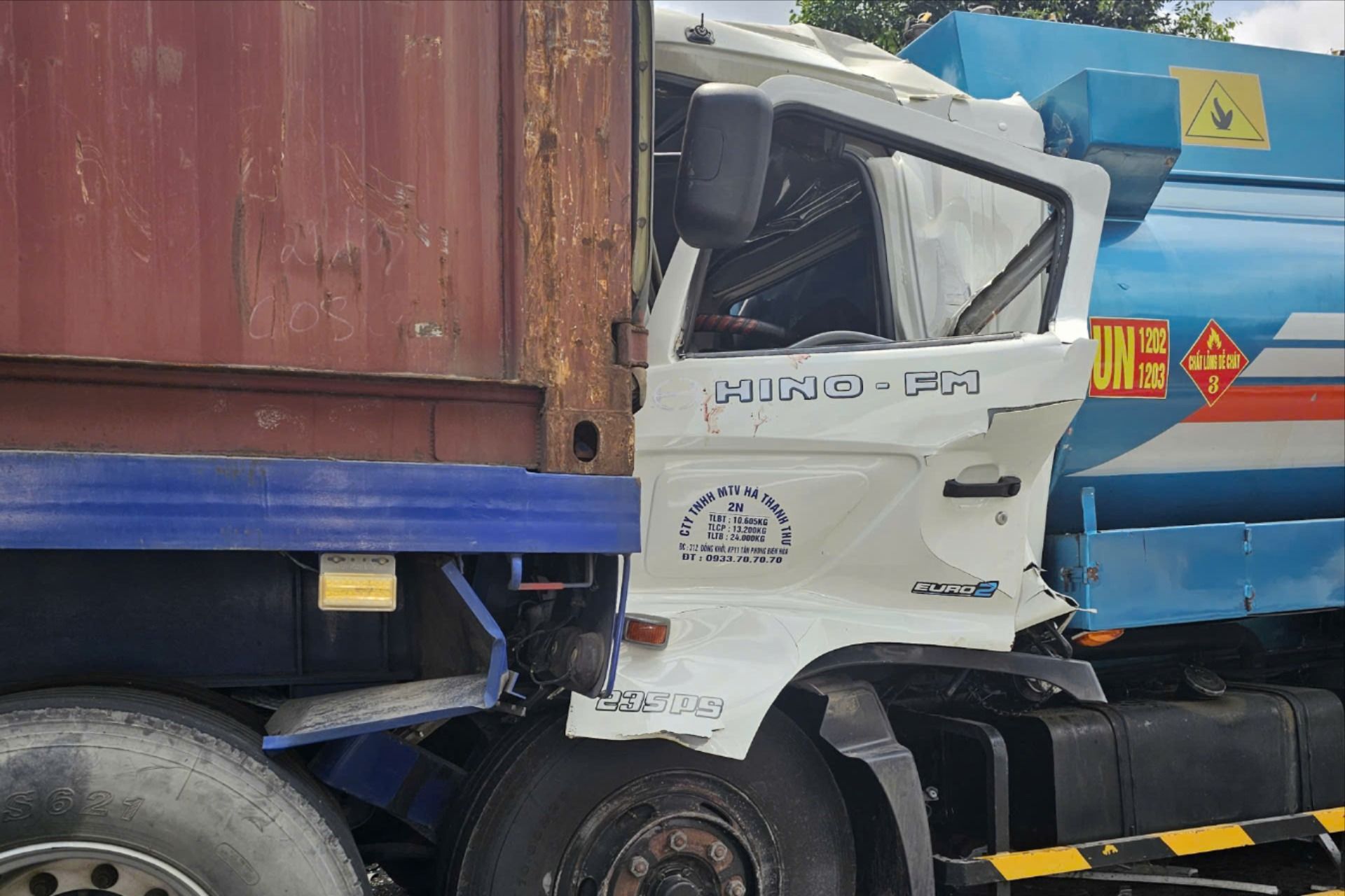 Cú va chạm mạnh khiến phần đầu xe bồn lún sâu vào đuôi container, cabin biến dạng hoàn toàn. Tài xế xe bồn bị kẹt cứng trong cabin.
