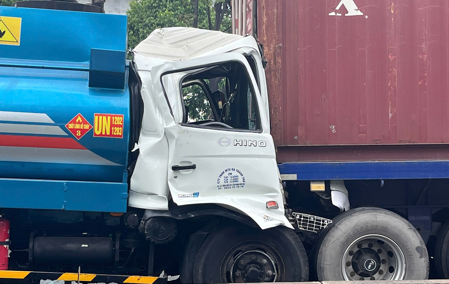 Cú va chạm mạnh khiến đầu xe bồn bị lún sâu vào rơ-moóc của xe container, gây biến dạng nghiêm trọng.