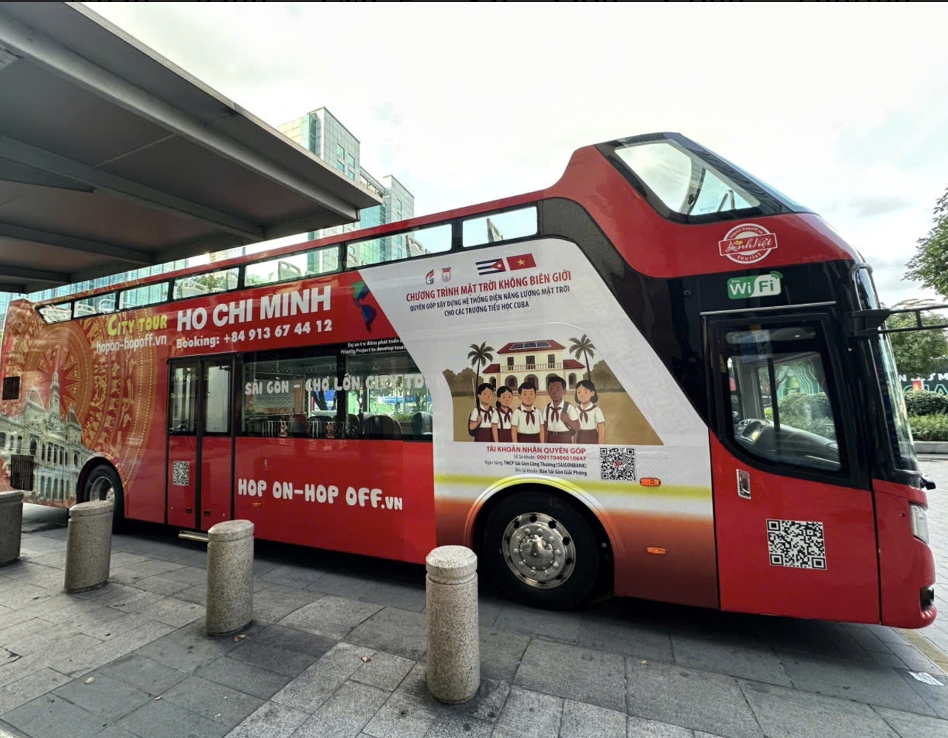 Từ ngày 10-10, Ảnh Việt trang trí xe buýt 2 tầng thoáng nóc Hop On Hop Off với hình ảnh và thông điệp “Mặt trời không biên giới”, triển khai trong suốt một tháng. Trên thân xe, mã QR quyên góp được bố trí nổi bật, giúp hành khách và người dân dễ dàng tham gia ủng hộ.