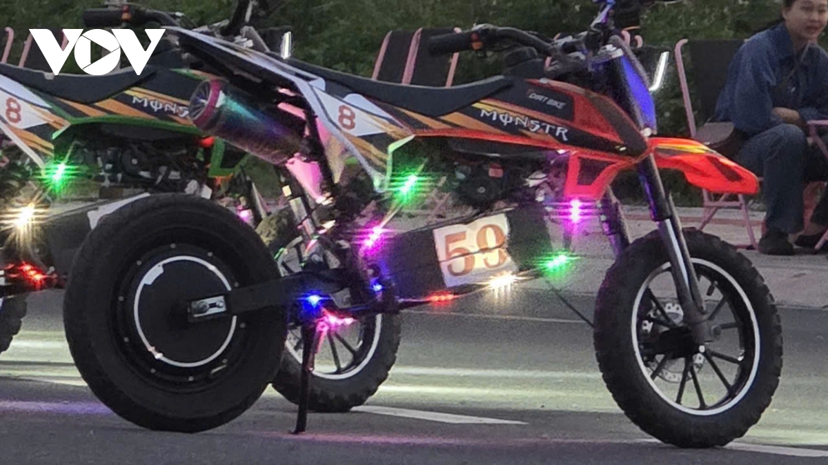 Người lớn chở trẻ em trên cào cào mini đua trên đường phố trước cổng UBND phường Đông Hưng Thuận