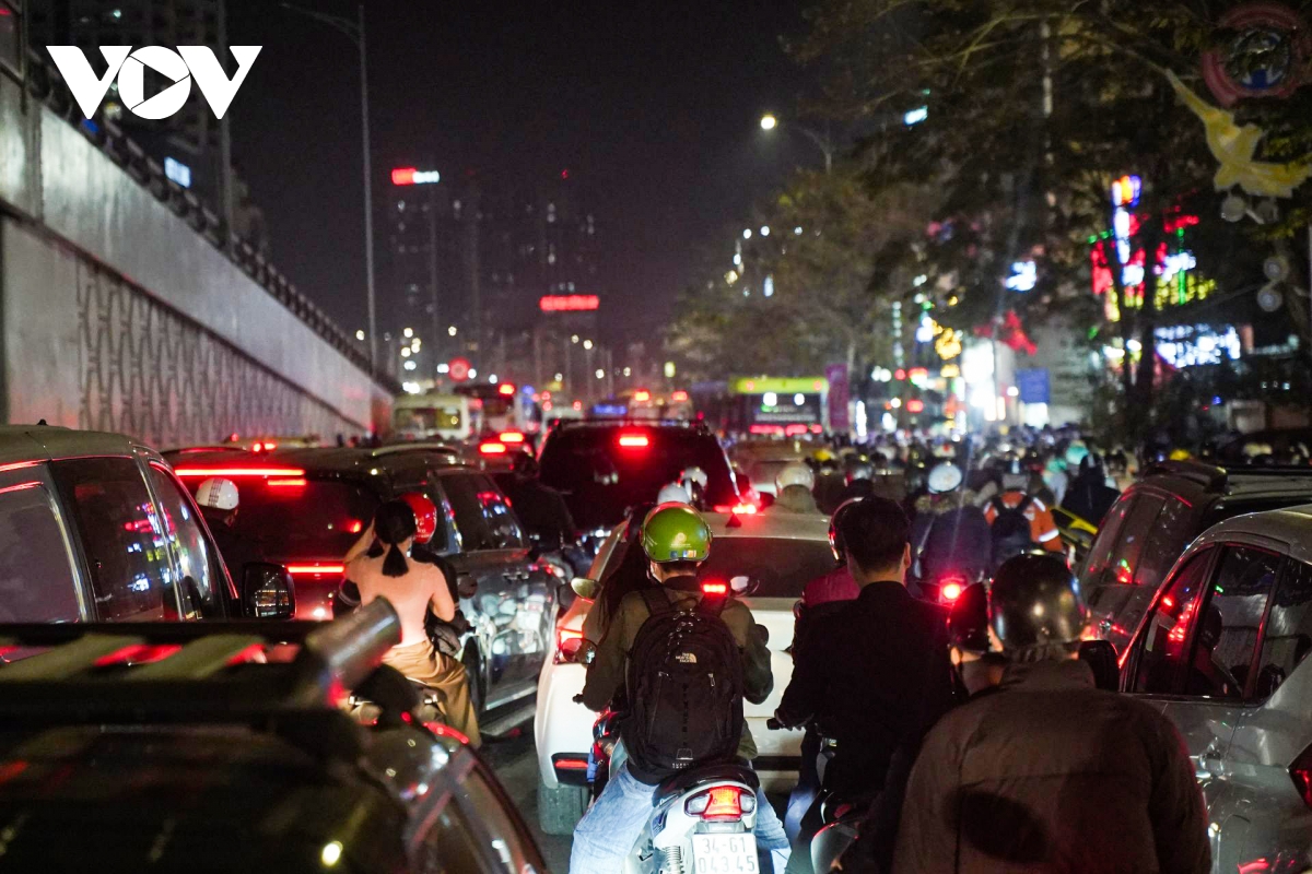 Các phương tiện nối đuôi, gần như đứng yên trong giờ cao điểm tối 6/2 tại khu vực cầu Vĩnh Tuy, theo cả hai chiều lưu thông.