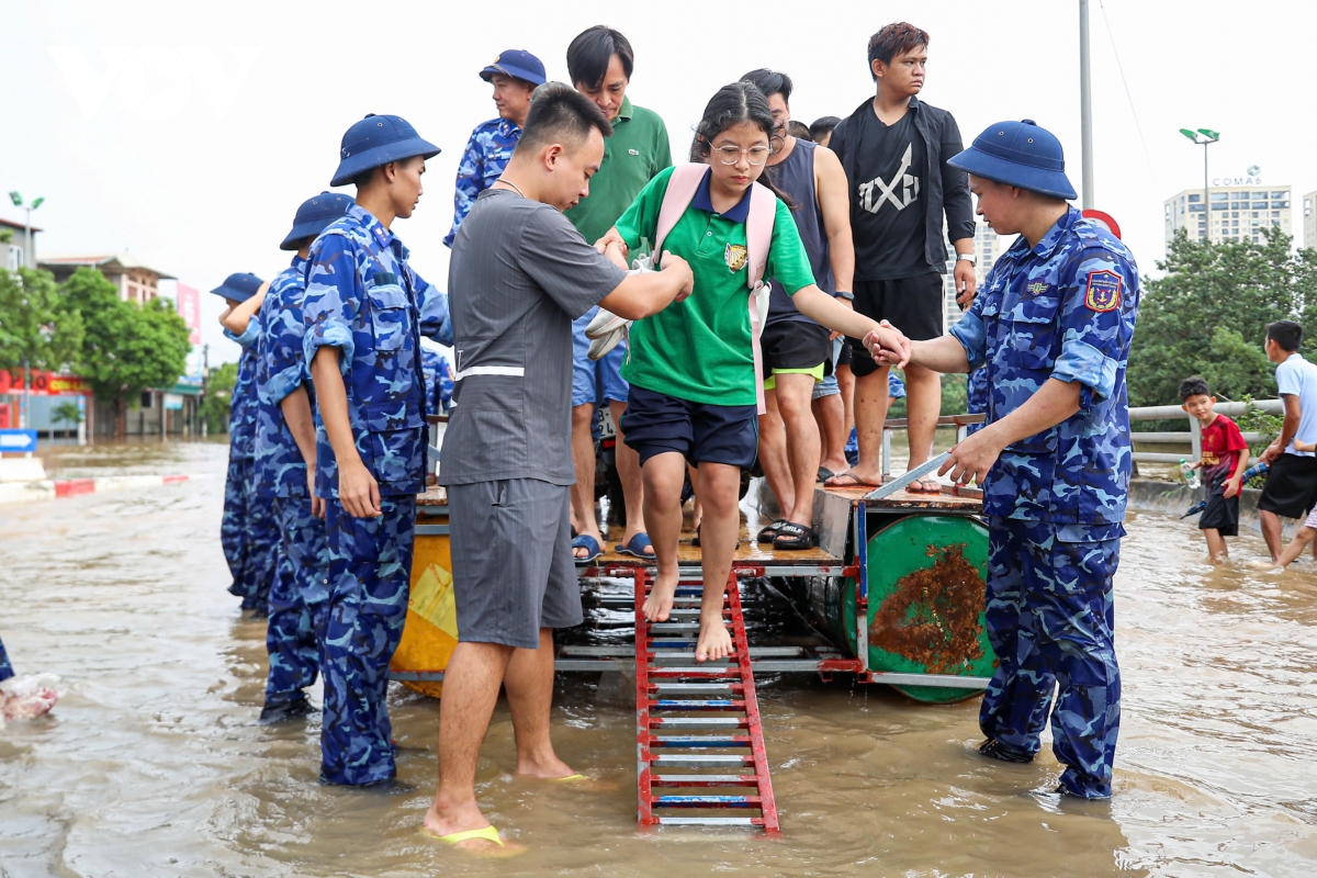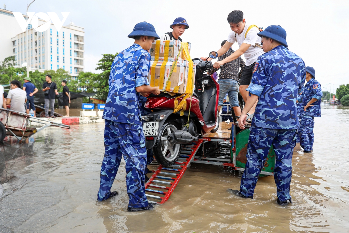 Các chiến sĩ đưa hàng trăm lượt người và phương tiện qua khu vực ngập sâu ở quốc lộ 70 (Hà Nội).