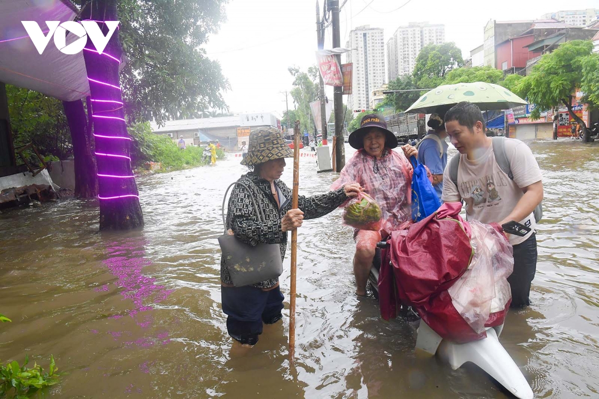 Tại đoạn quốc lộ 70 lên cầu vượt Tây Mỗ (Hà Nội), mực nước có lúc gần chạm thắt lưng người, hàng trăm phương tiện ách tắc, người dân loay hoay giữa dòng ngập.