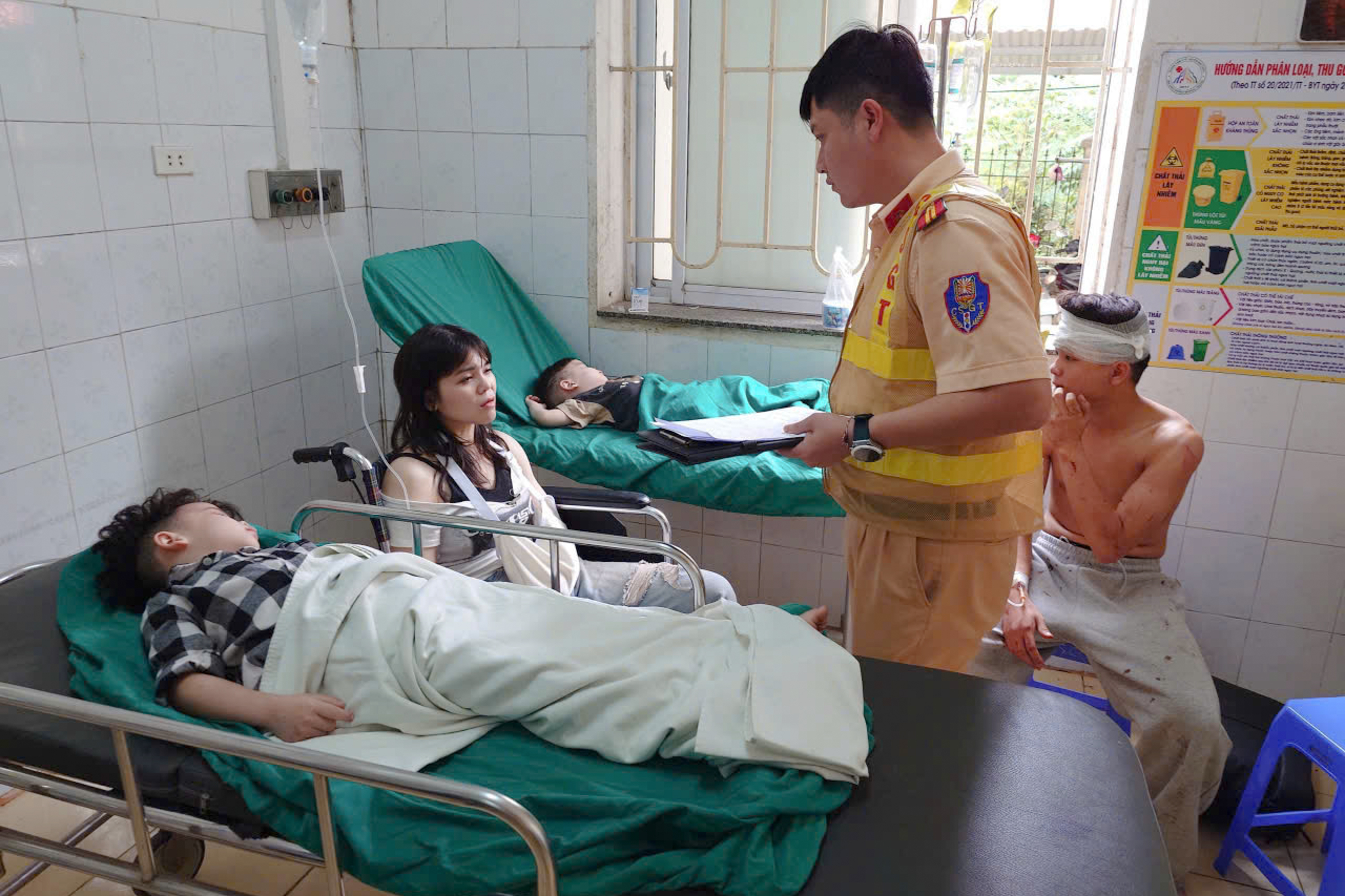Cán bộ Phòng CSGT Công an tỉnh Sơn La hỏi thăm tình hình sức khỏe của những người bị thương. (Ảnh: C.T.)