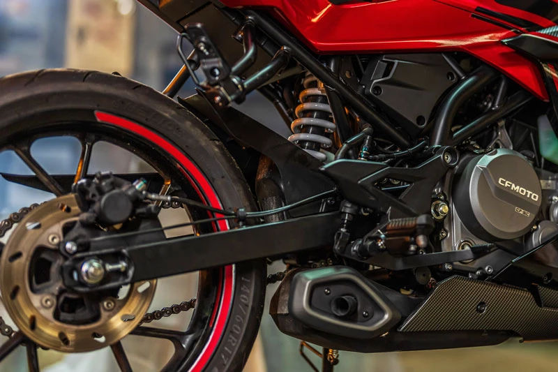 Cung cấp sức mạnh cho CFMoto 250SR Lite 2025 là khối động cơ DOHC 4 thì, xi lanh đơn với dung tích 249cc, làm mát bằng chất lỏng. Động cơ này cho công suất tối đa 27,5 mã lực tại 9.750 vòng/phút và mô-men xoắn cực đại 22 Nm tại 7.250 vòng/phút. Sức mạnh này được truyền tới bánh sau thông qua hộp số 6 cấp, tích hợp bộ ly hợp chống trượt (slipper clutch) giúp thao tác sang số mượt mà hơn và giảm hiện tượng khóa bánh khi dồn số.