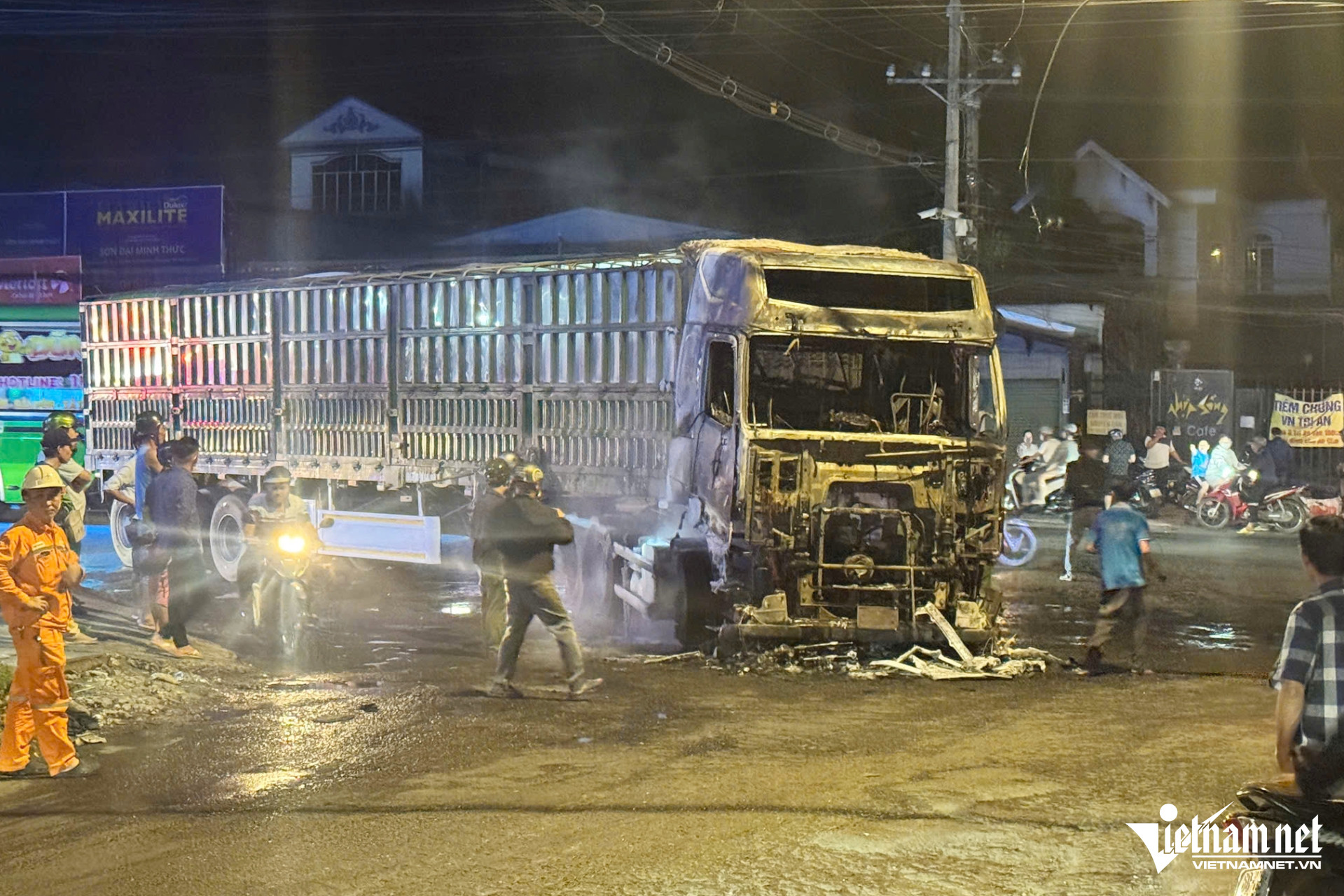 Hiện trường vụ cháy xe container. Ảnh: Hoàng Anh