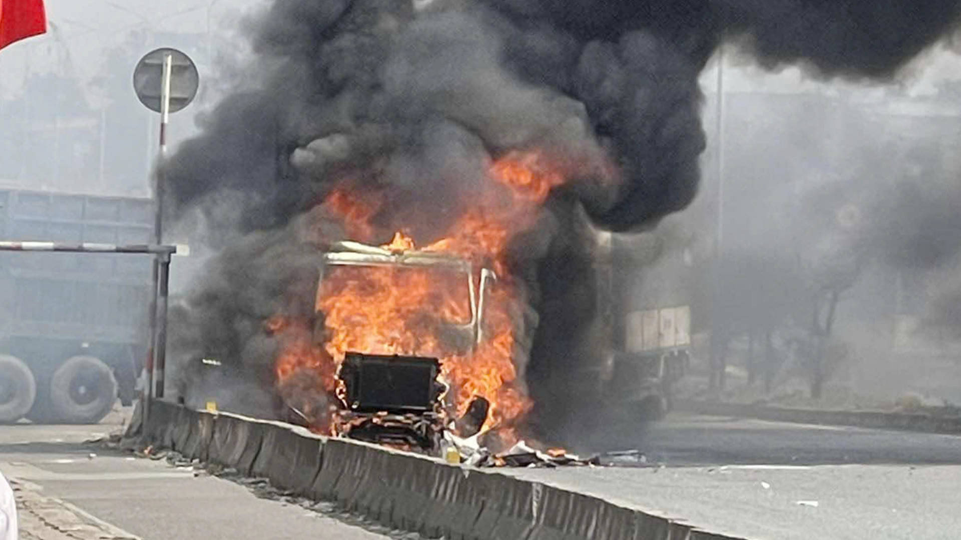 Phát hiện cháy, tài xế nhanh chóng cho xe dừng lại, rời khỏi cabin và hô hoán người đi đường hỗ trợ. Chỉ ít phút sau, ngọn lửa bùng phát dữ dội, bao trùm toàn bộ phần đầu xe, khói đen cuồn cuộn bốc cao hàng chục mét.