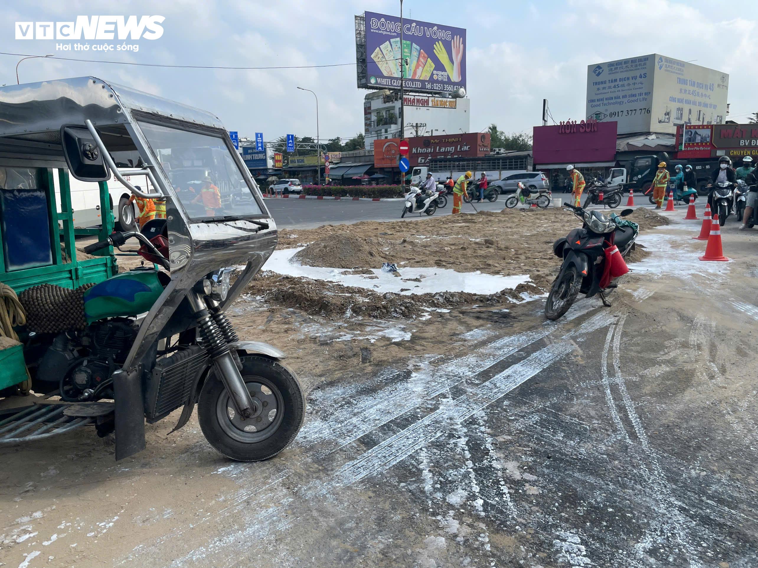 Nhằm đảm bảo an toàn cho các phương tiện lưu thông, lực lượng chức năng huy động công nhân vệ sinh môi trường rải cát lên các vệt sơn tràn, tiến hành thu dọn, làm sạch mặt đường.