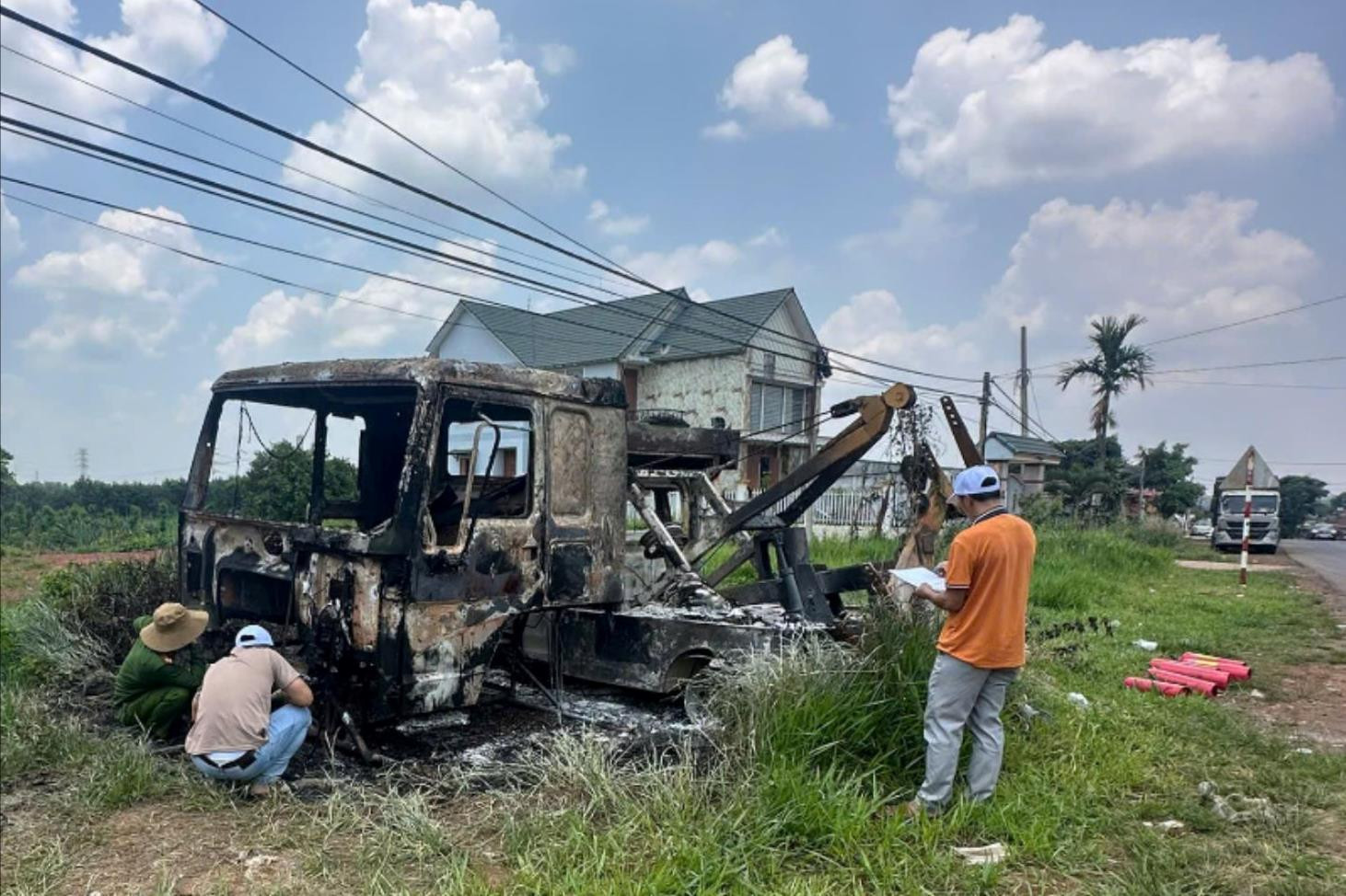 Công an xã Nhân Cơ phối hợp với các cơ quan liên quan điều tra, làm rõ nguyên nhân xe tải cứu hộ bị cháy rụi. (Ảnh: Người dân cung cấp)