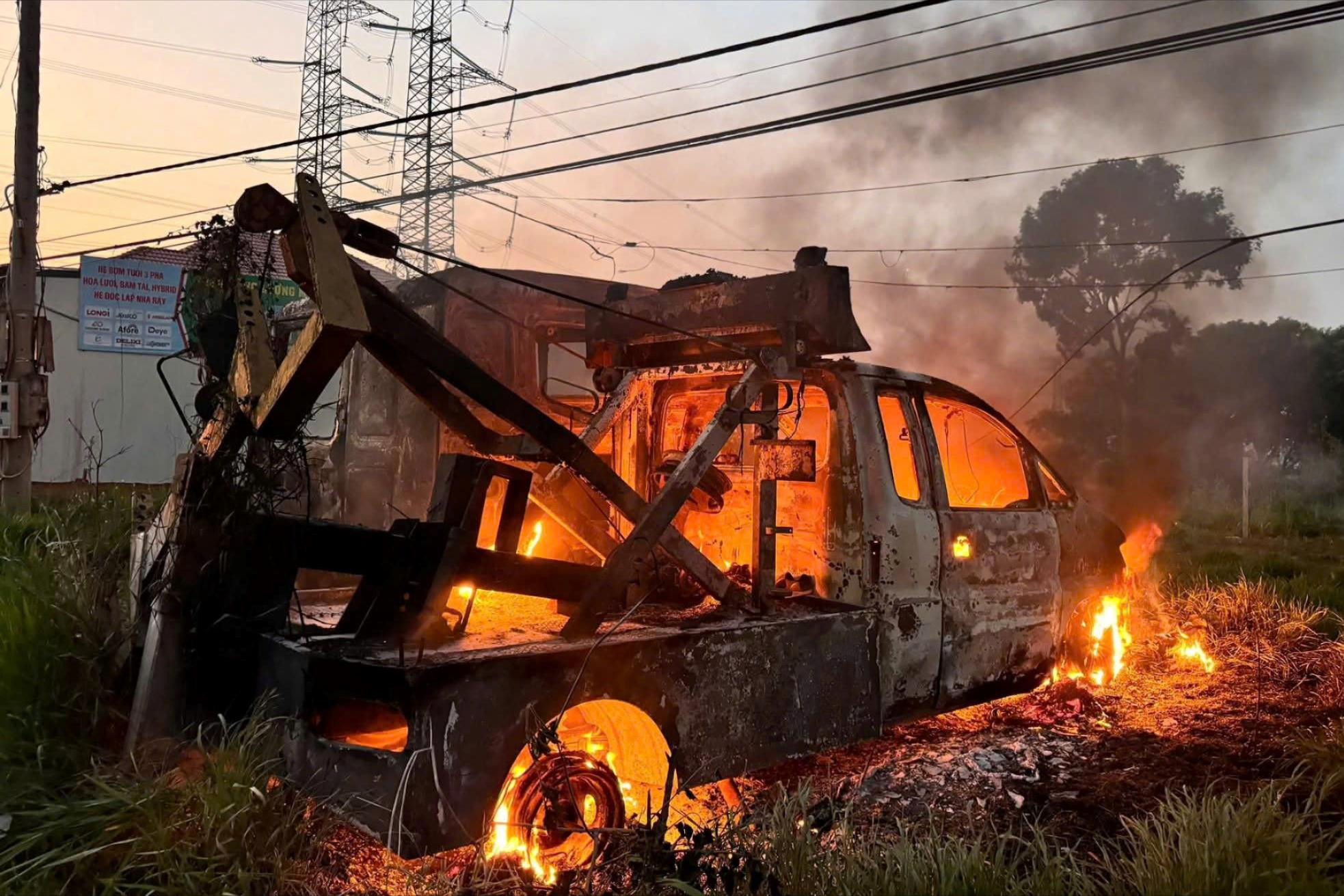Chiếc xe tải cứu hộ bị cháy rụi hoàn toàn. (Ảnh: Người dân cung cấp)