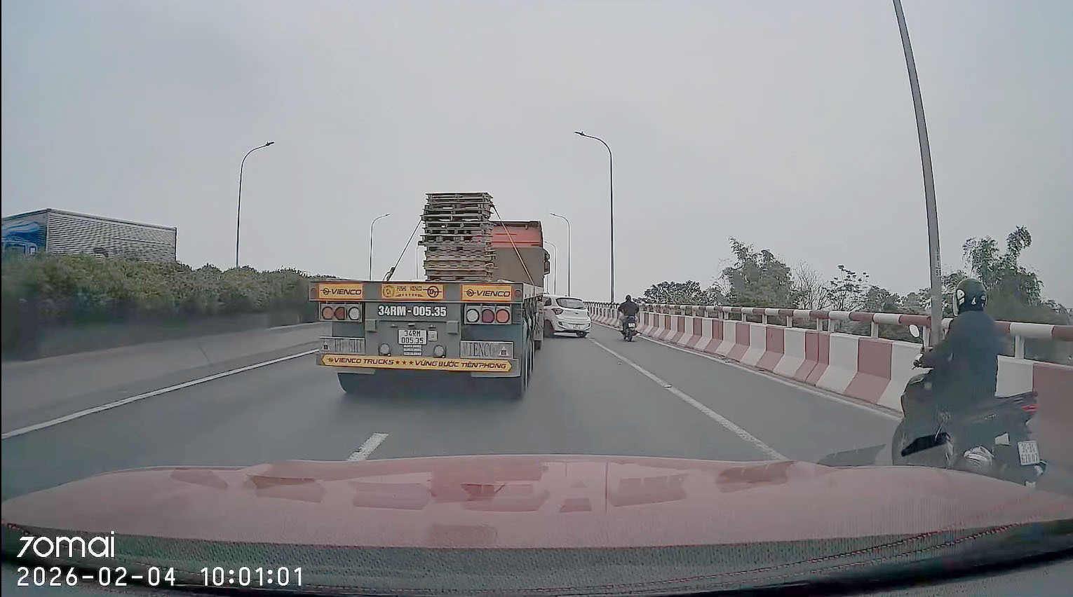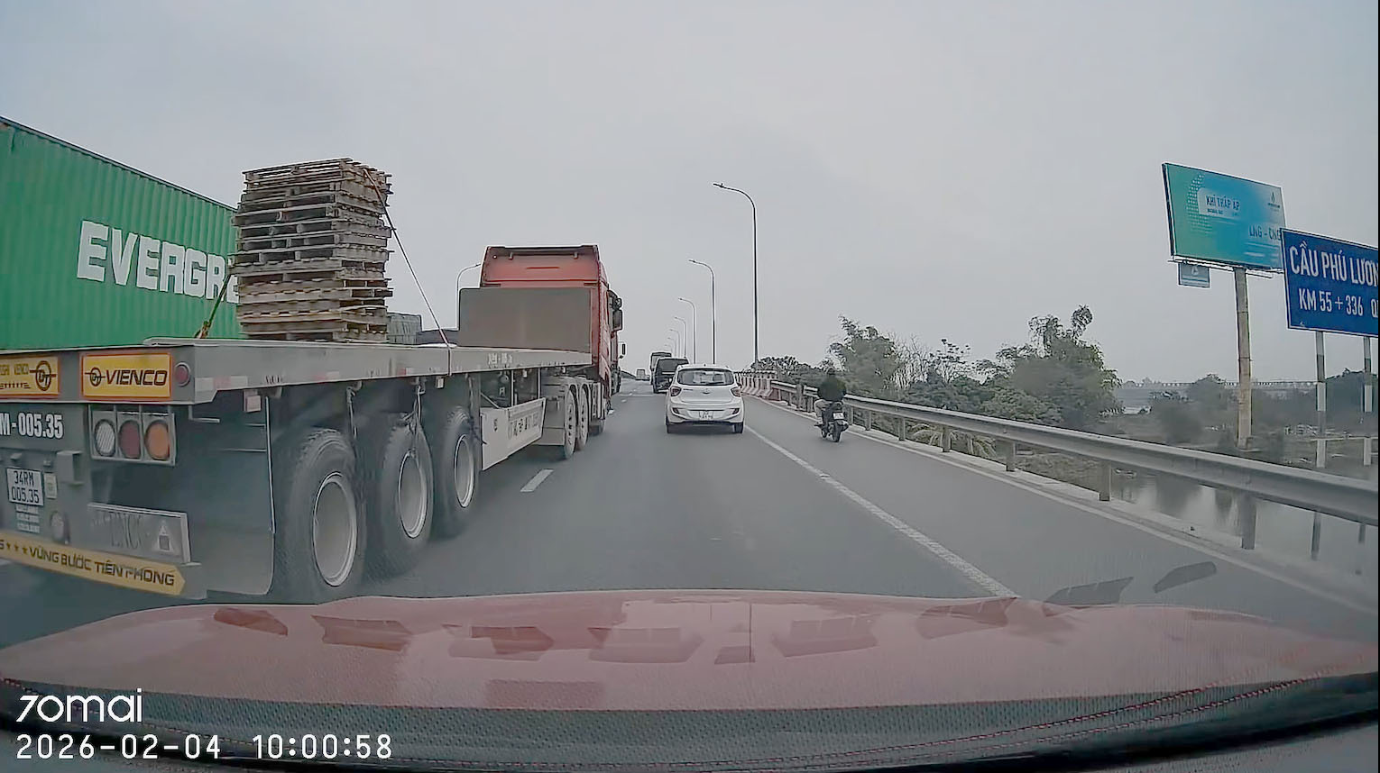 Theo video được chia sẻ, khoảng 10h ngày 4/2, xe đầu kéo mang BKS rơ-moóc 34RM-005.35 đang chạy ở làn 1 song song với xe ô tô con (chưa rõ biển số) chạy ở làn 2 trên đoạn đường dẫn lên cầu Phú Lương. Phía trước cả 3 làn đường có nhiều xe ô tô, xe tải, xe máy đang đi.