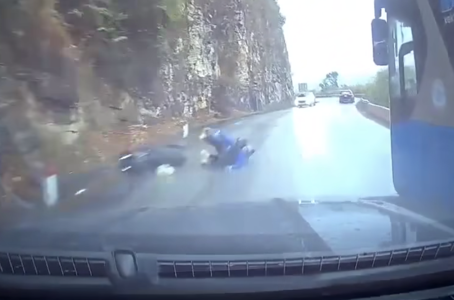 Khi tài xế cố vượt xe khách, đúng lúc này ở chiều ngược lại có 2 người ngồi trên xe máy đi tới. Do đường hẹp, trơn trượt, trước tình huống bất ngờ, tài xế xe máy phanh gấp khiến cả hai ngã ra đường và bị ô tô cán qua.
