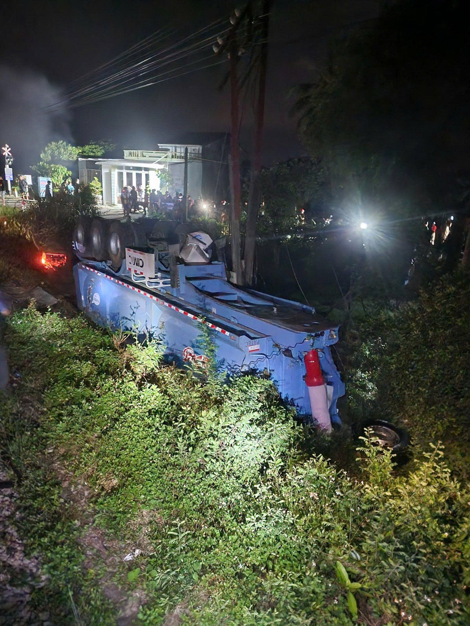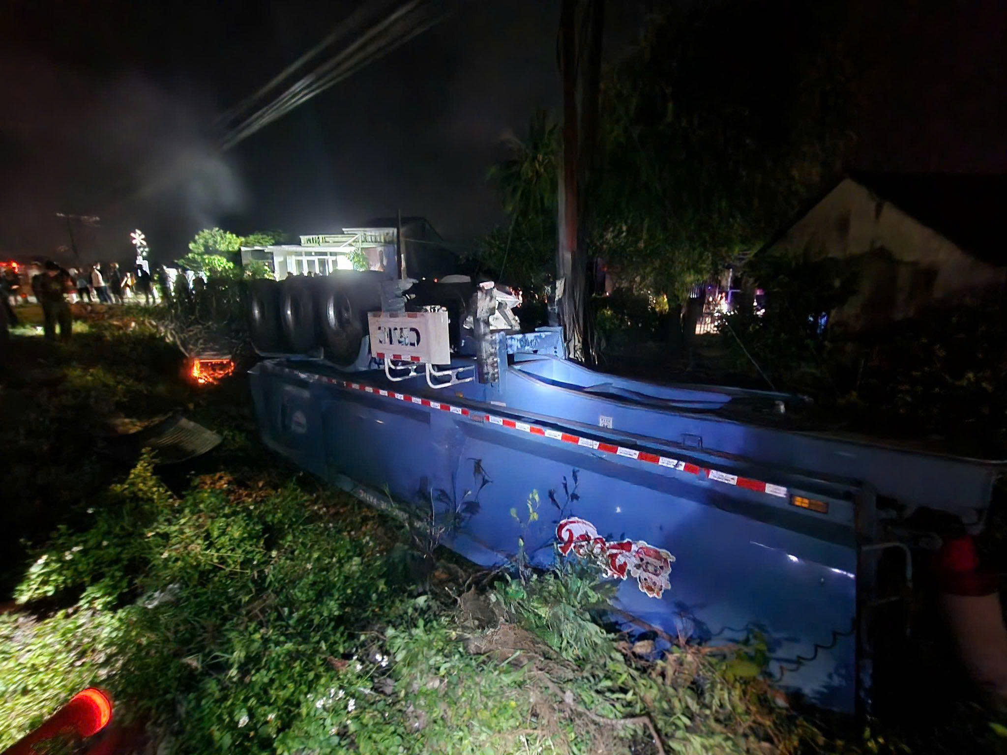 Hiện trường vụ tai nạn, xe tải bị tàu hỏa tông biến dạng