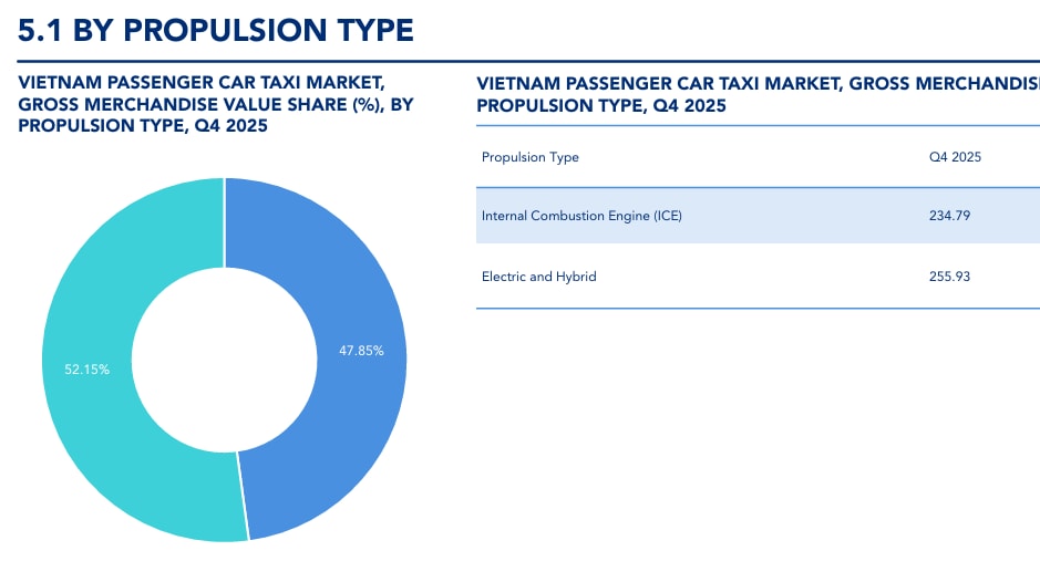 Báo cáo của Mordor Intelligence chỉ ra rằng, tổng giá trị giao dịch của thị trường taxi Việt Nam đạt 490,7 triệu USD trong quý 4/2025. Đáng chú ý, phân khúc xe điện và xe hybrid đã mang về 255,93 triệu USD, tương đương 52,15% thị phần doanh thu. Trong khi đó, xe sử dụng động cơ đốt trong (ICE) chỉ chiếm 47,85%, tương ứng với 234,79 triệu USD.