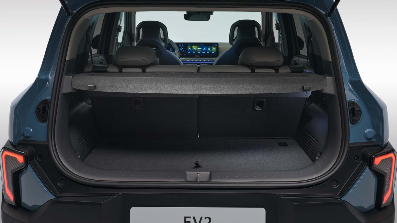 Về không gian, EV2 có trục cơ sở 2.565 mm nhưng Kia khẳng định xe vẫn mang lại khoang nội thất rộng rãi. Khách hàng có thể lựa chọn cấu hình 4 hoặc 5 chỗ, với hàng ghế có khả năng trượt và ngả linh hoạt nhằm tối ưu không gian để chân hoặc khoang hành lý.