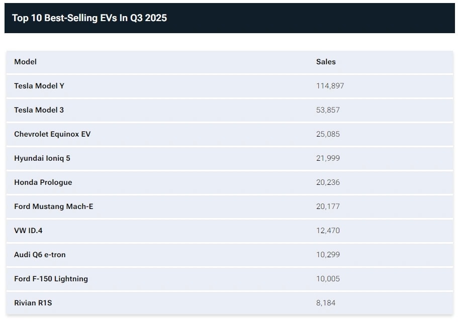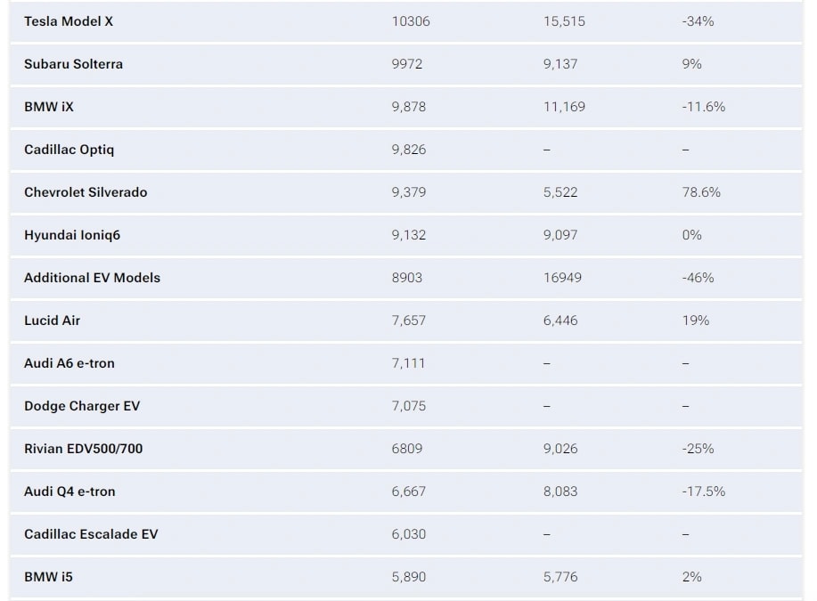 Một bất ngờ thú vị trong quý là sự xuất hiện của Audi Q6 e-tron với 10.299 xe được bán ra, vượt qua cả mẫu bán tải điện Ford F-150 Lightning (10.005 xe). Các mẫu xe khác cũng ghi nhận doanh số tốt bao gồm Rivian R1S (8.184 xe), Chevrolet Blazer EV (8.089 xe), Kia EV9 (7.510 xe) và Cadillac Lyriq (7.309 xe).