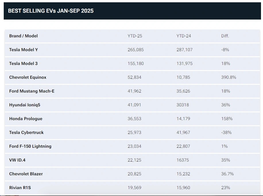 Xét theo từng mẫu xe trong 9 tháng, Tesla Model Y dẫn đầu với 265.085 xe, theo sau là Model 3 với 155.180 xe. Chevrolet Equinox EV vươn lên vị trí thứ ba với 52.834 xe, ghi nhận mức tăng trưởng ấn tượng 390%. Các mẫu xe khác trong top 10 bao gồm Ford Mustang Mach-E (41.962 xe), Hyundai Ioniq 5 (41.091 xe) và Honda Prologue (36.553 xe).