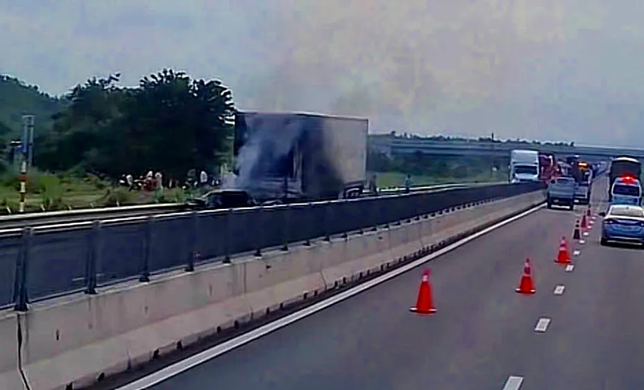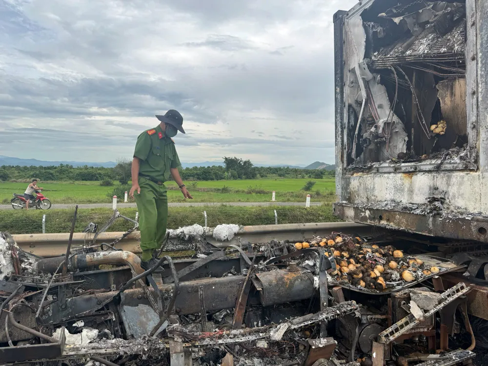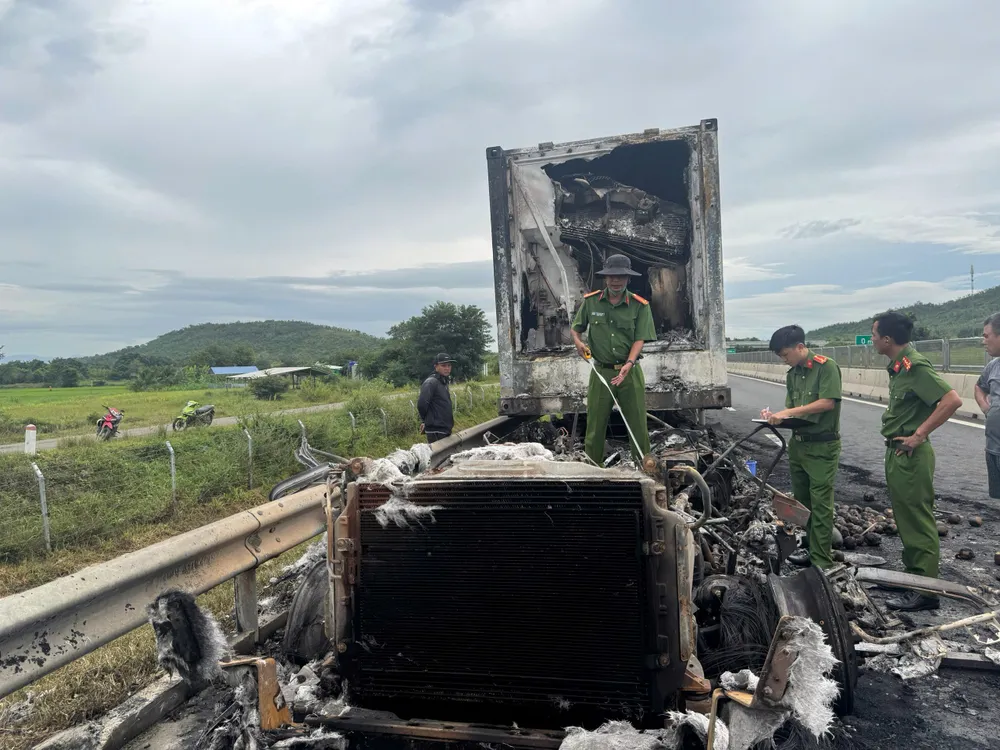 Xe đông lạnh chở trái cây bị cháy trên cao tốc Vĩnh Hảo - Phan Thiết.