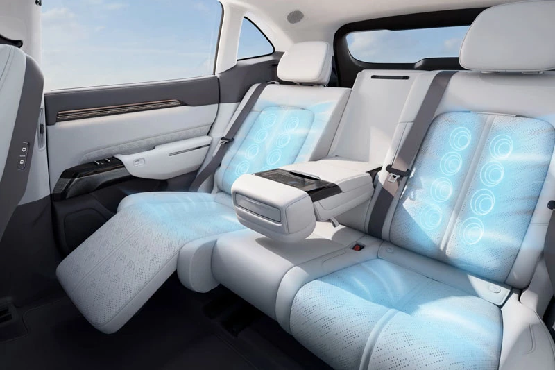 Các ghế sau của Zeekr 7X 2026 có thanh trượt điện, góc ngả tối đa 70° và hỗ trợ sưởi graphene, trong khi toàn bộ cửa xe được trang bị kính hai lớp cách âm, và trần xe phủ da lộn cao cấp giúp tăng cảm giác sang trọng.