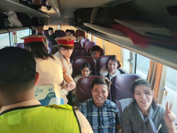 Cán bộ chiến sĩ Trạm CSGT Hòa Nhơn tiếp sức hành khách trên xe tiếp tục hành trình an toàn về quê đón Tết.