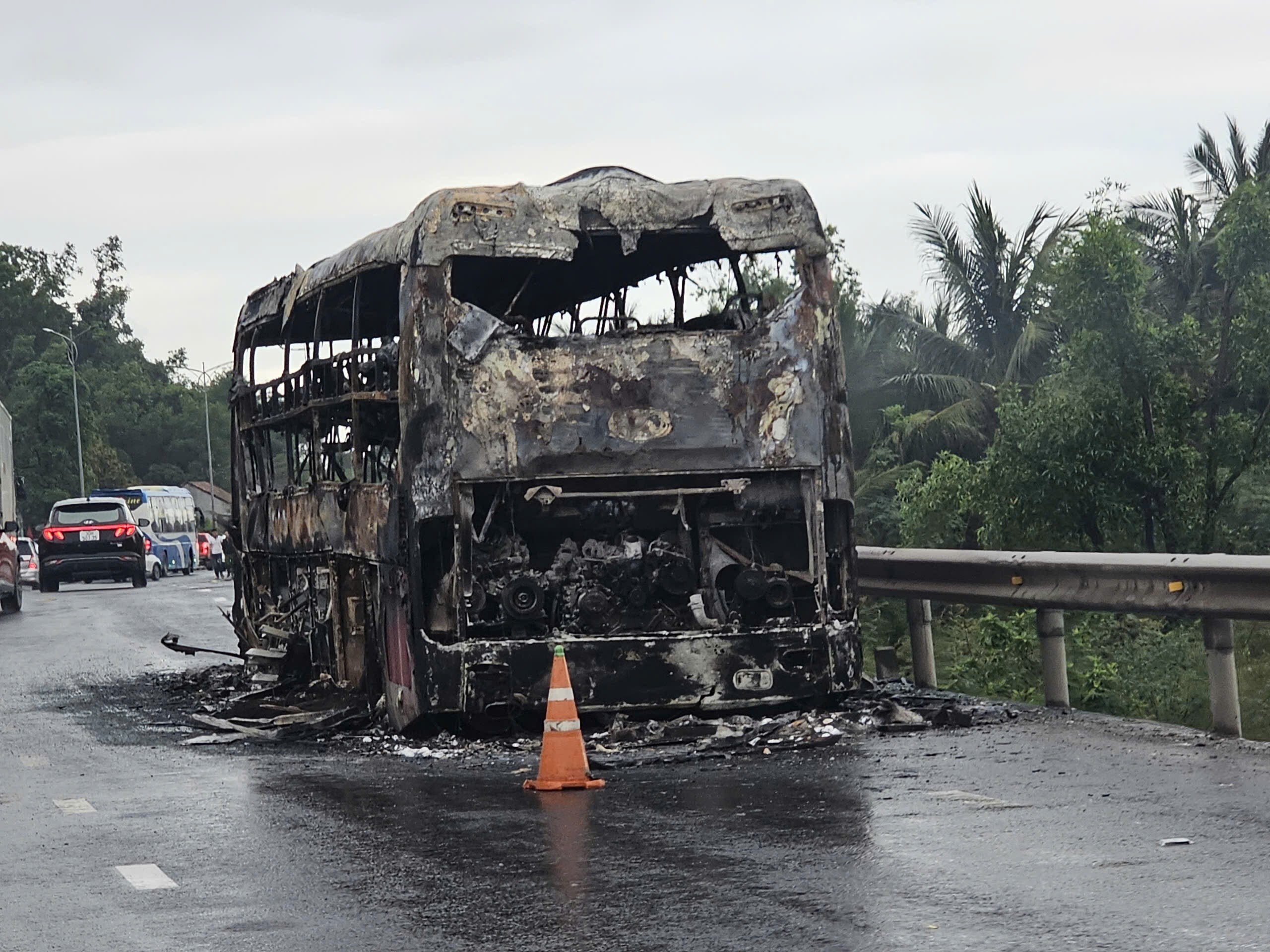 Riêng xe khách bốc cháy dữ dội, lan rộng ra toàn bộ xe và cháy rụi chỉ còn trơ khung. Thiệt hại ban đầu ước tính khoảng 3 tỷ đồng.