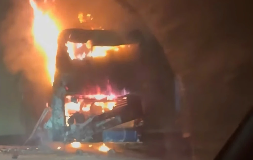 Lúc này, tài xế phát hiện đuôi xe khách có cháy nên nhanh chóng dừng xe. Đồng thời, hướng dẫn chín hành khách xuống xe an toàn và di dời hàng hóa.