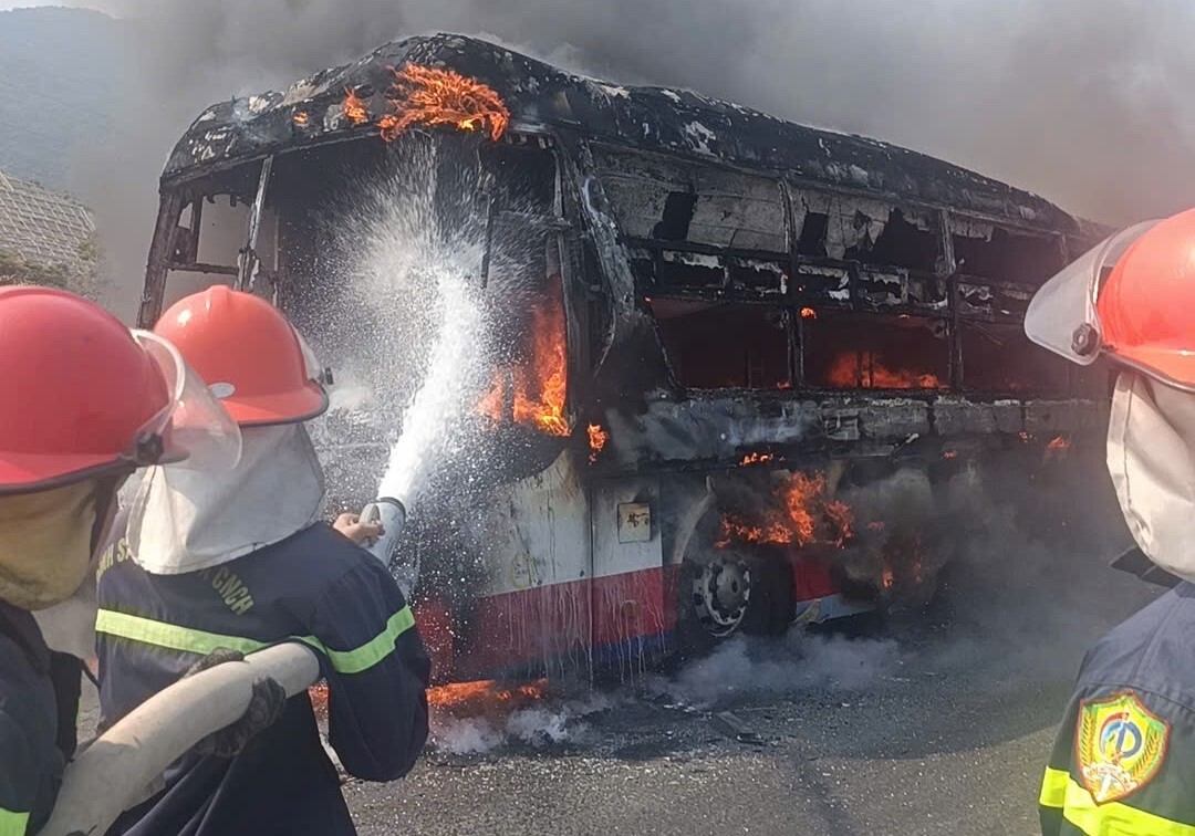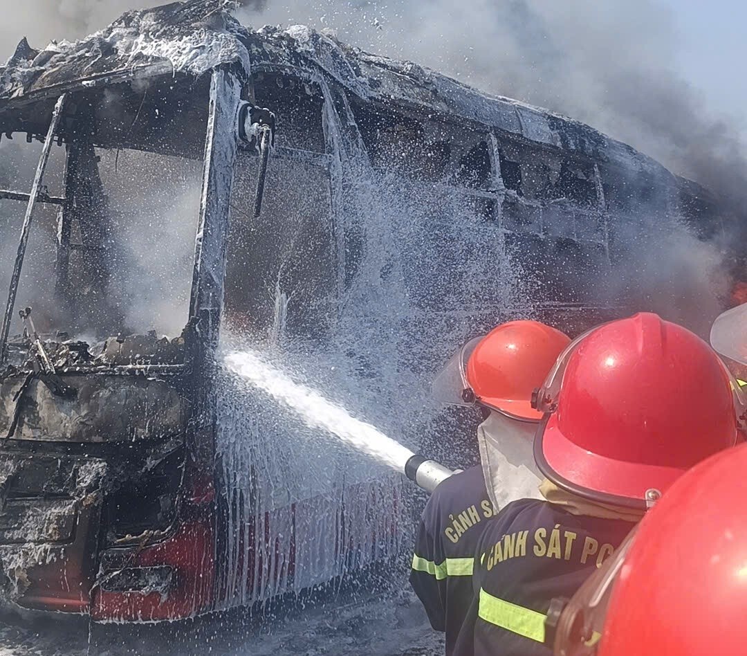 Phát hiện cháy, những người trên xe kịp thời thoát ra ngoài an toàn. Ngọn lửa bùng phát nhanh đã thiêu rụi toàn bộ chiếc xe khách. Trên xe không chở hàng hóa.