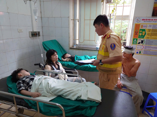 Cán bộ Phòng CSGT Công an tỉnh Sơn La hỏi thăm tình hình sức khỏe của những người bị thương.