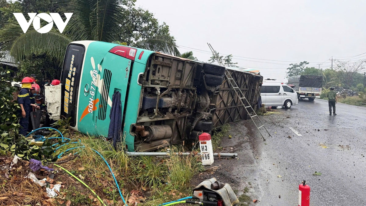 Khi đến đoạn đường cong thuộc thôn Sơn Thọ, xã Thọ Sơn, tỉnh Đồng Nai, gặp lúc trời mưa lớn, đường trơn trượt khiến phương tiện bất ngờ mất lái, lật nghiêng vào lề đường.