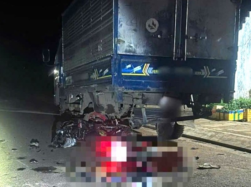 Theo camera nhà dân ghi lại, thời điểm trước khi xảy ra tai nạn, tiếng động cơ xe máy di chuyển với tốc độ cao rồi đâm mạnh vào phía sau bên trái xe tải.