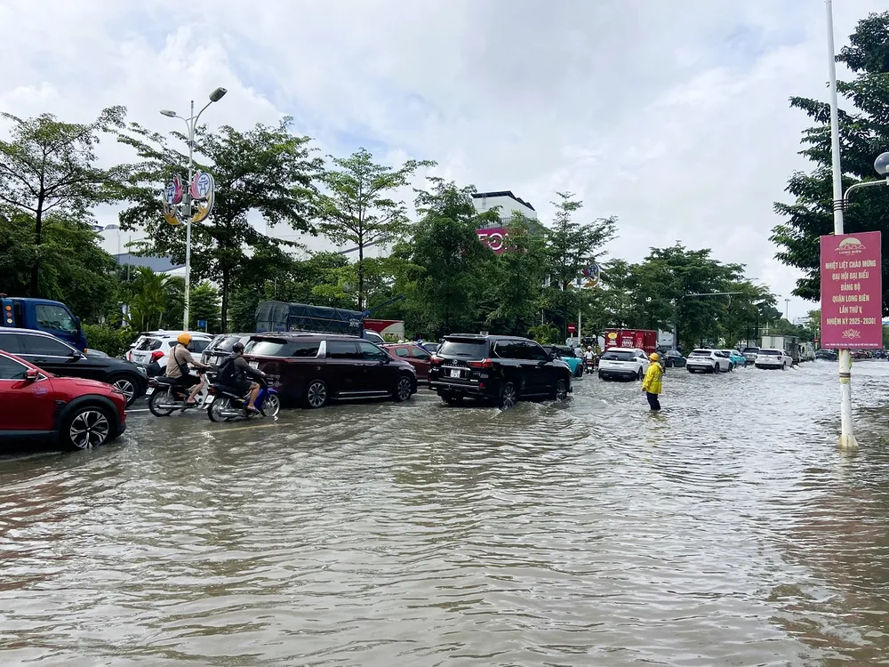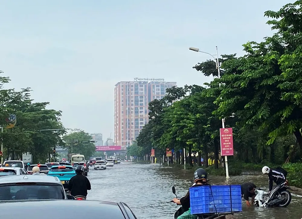 Sáng 1-10, nhiều nơi ở Hà Nội vẫn ngập sâu dưới nước. Ghi nhận của chúng tôi tại khu vực đường Đàm Quang Trung, đoạn qua Aeon mall Long Biên vẫn còn ngập nước kéo dài.