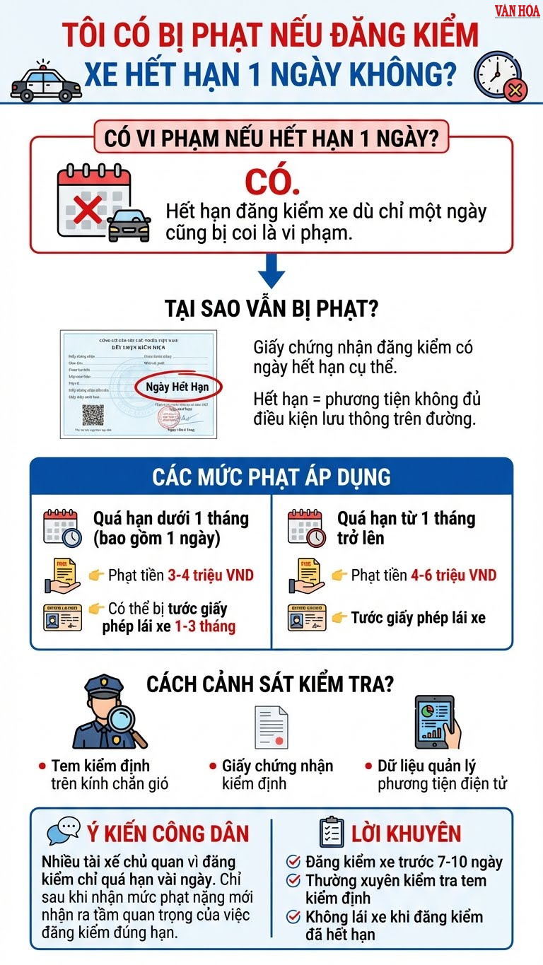 Vì vậy, xe ô tô hết hạn đăng kiểm dù chỉ 1 ngày vẫn bị xem là vi phạm nếu tham gia giao thông và bị lực lượng chức năng kiểm tra. Pháp luật không có quy định “gia hạn” hay “linh động” đối với trường hợp quá hạn ngắn ngày.