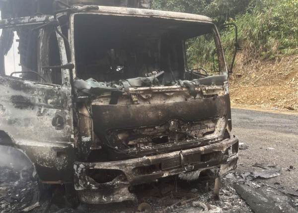 Vụ cháy không gây thương vong về người nhưng ngọn lửa đã thiêu rụi chiếc xe tải chỉ còn lại khung sắt.