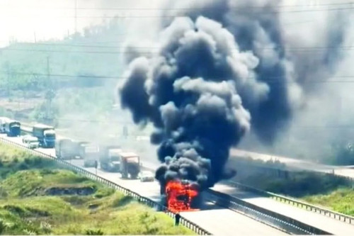 Ít phút sau, ngọn lửa bùng cháy dữ dội, bao trùm xe. Tài xế may mắn mở cửa thoát ra ngoài. Vụ hỏa hoạn khiến tuyến cao tốc theo chiều Nam - Bắc qua khu vực bị ùn tắc kéo dài nhiều giờ.