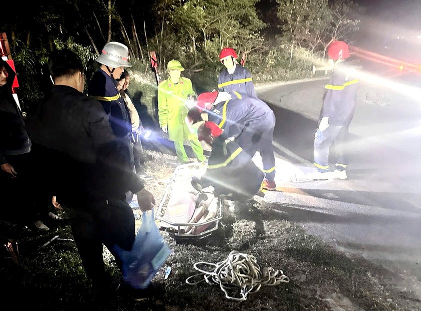 Nhanh chóng triển khai phương án cứu nạn nhân bị mắc kẹt trong cabin xe dưới vực sâu khoảng 100m. Ảnh: TL