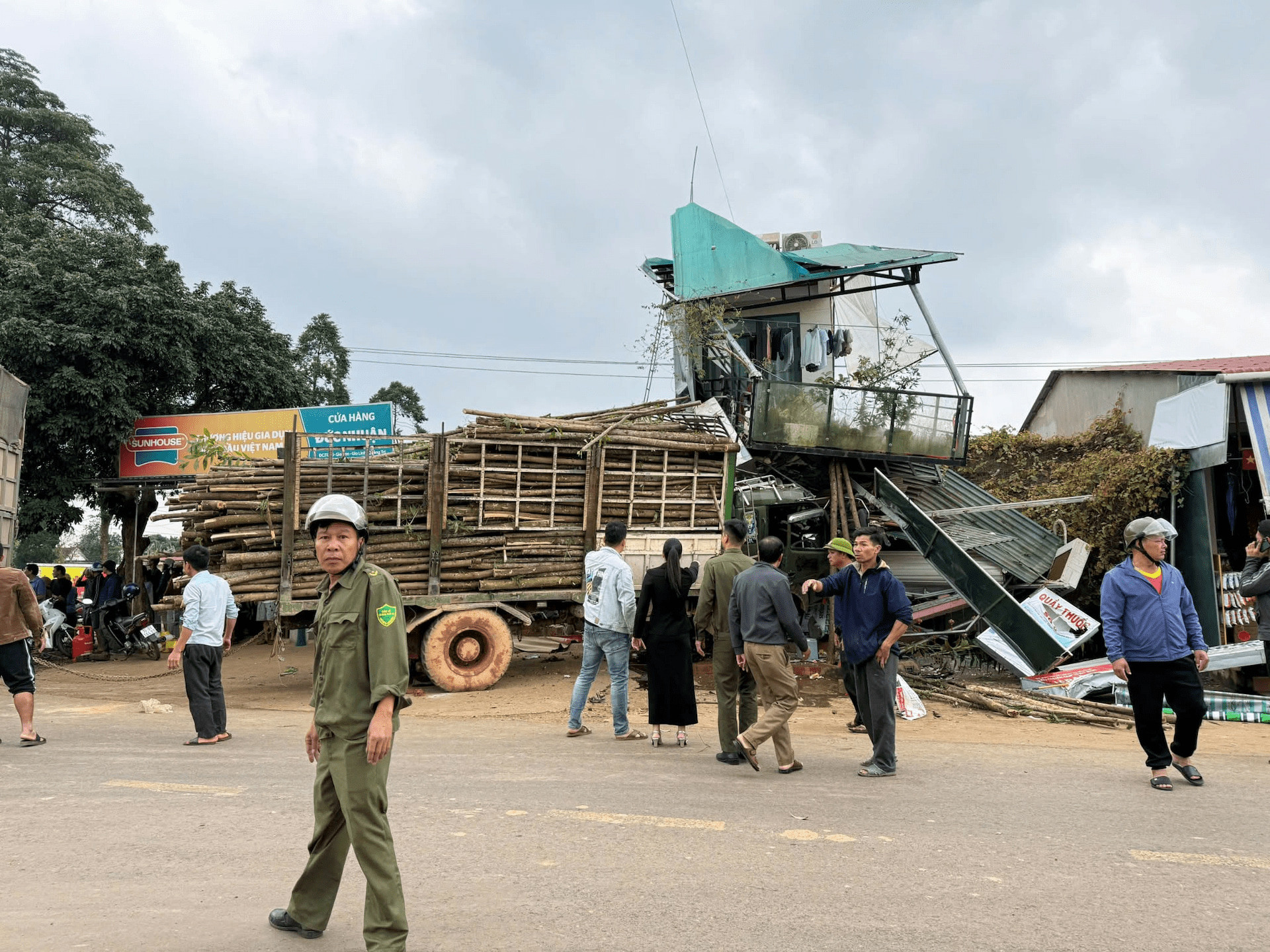 Sau cú va chạm, xe tải tiếp tục mất lái, lao vào các hàng quán ven đường, làm hư hỏng một phần của hai cửa hàng.