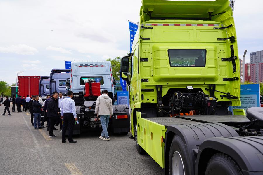 Xe tải hạng nặng sử dụng năng lượng xanh được trưng bày tại tỉnh Sơn Tây, Trung Quốc, ngày 18/5/2025. Ảnh tư liệu: THX