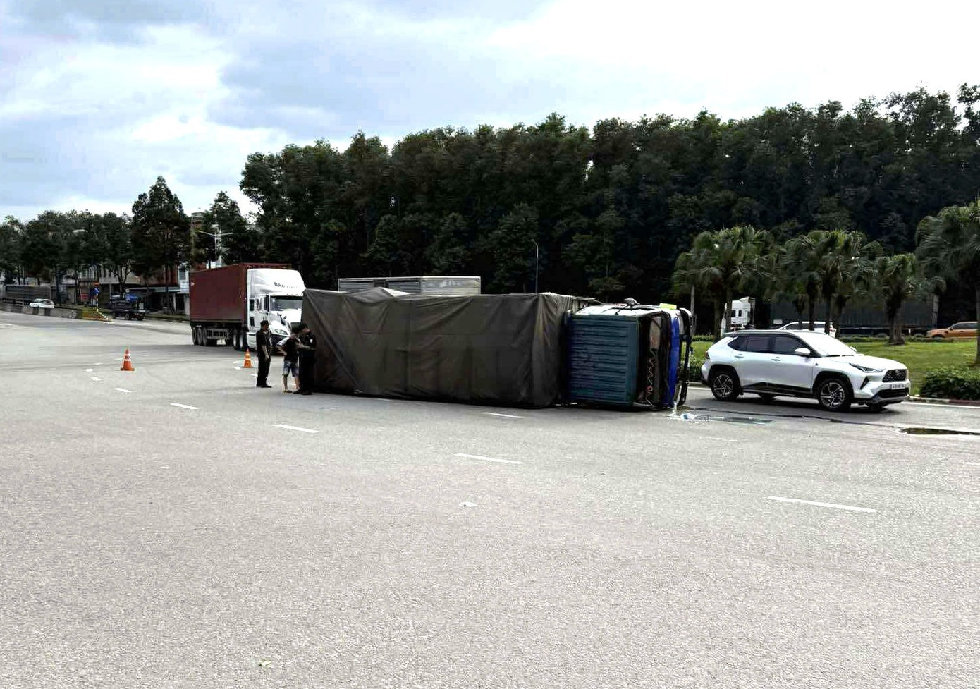 Khi tới vòng xoay thuộc địa bàn phường Thới Hòa, xe tải bị lật ngang. Người đi đường nhanh chóng đến hỗ trợ, đưa tài xế ra khỏi xe an toàn.