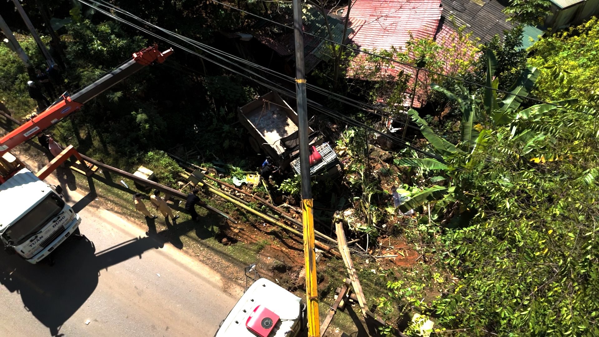 Tại hiện trường, xe tải bị hư hỏng nặng; lan can đường và một số hạng mục phụ trợ giao thông bị đổ gãy. Cây trồng và công trình phụ của hộ dân phía dưới taluy cũng bị ảnh hưởng.