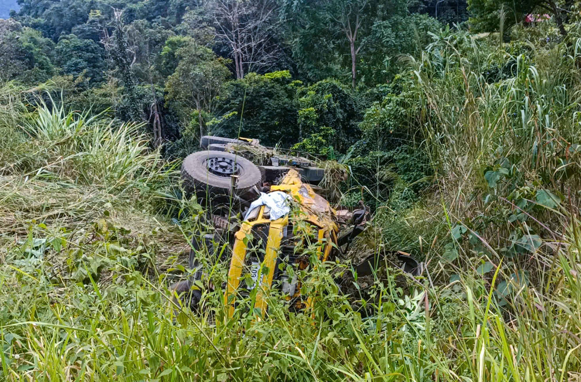 Chiếc xe bị cây rừng cản lại, nằm lưng chừng vực. Cú va chạm mạnh khiến cabin và thân xe biến dạng, hư hỏng nặng.