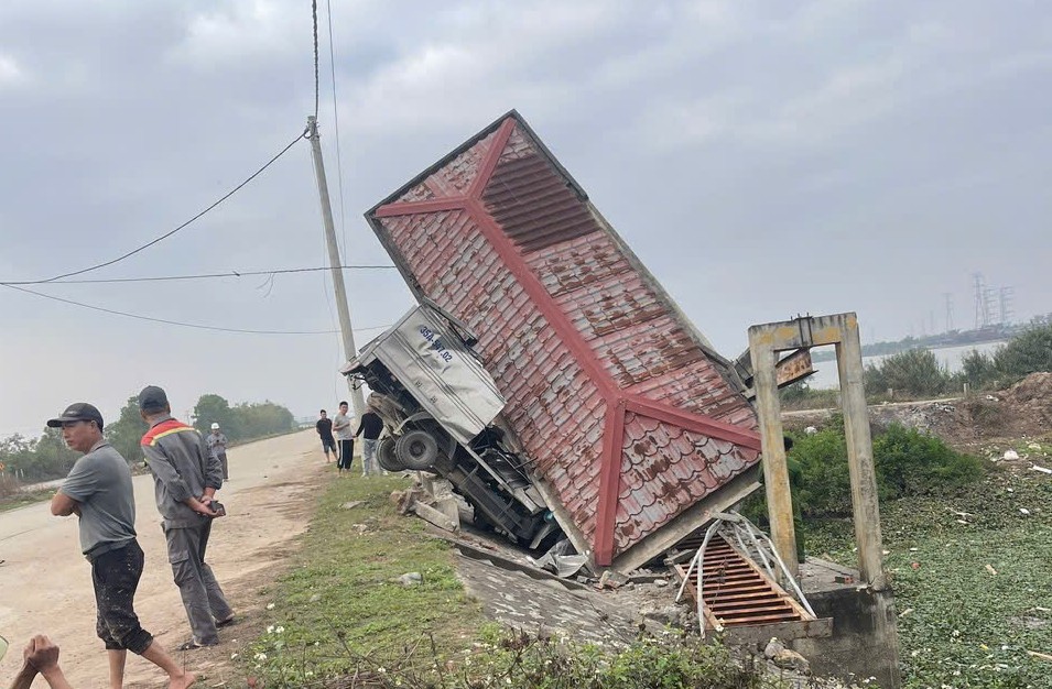 Trong quá trình di chuyển, chiếc xe mất lái, lao vào thành cầu ven đường. Cú va chạm mạnh khiến phần đầu xe tải bị biến dạng nghiêm trọng, một đoạn thành cầu cũng bị hư hỏng.