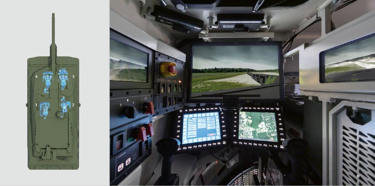 Mỗi vị trí kíp lái có màn hình trung tâm 23 inch và hai màn 10 inch, kết nối với sáu camera SCM60 quanh tháp pháo cho tầm nhìn 360 độ ngày/đêm.