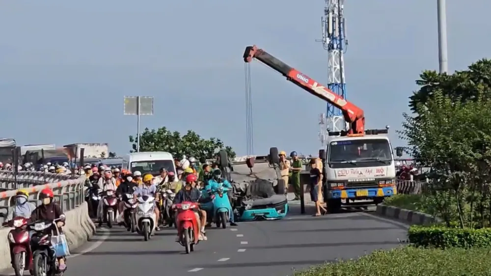 Lật xe taxi công nghệ trên cầu vượt Quang Trung, giao thông ùn ứ.